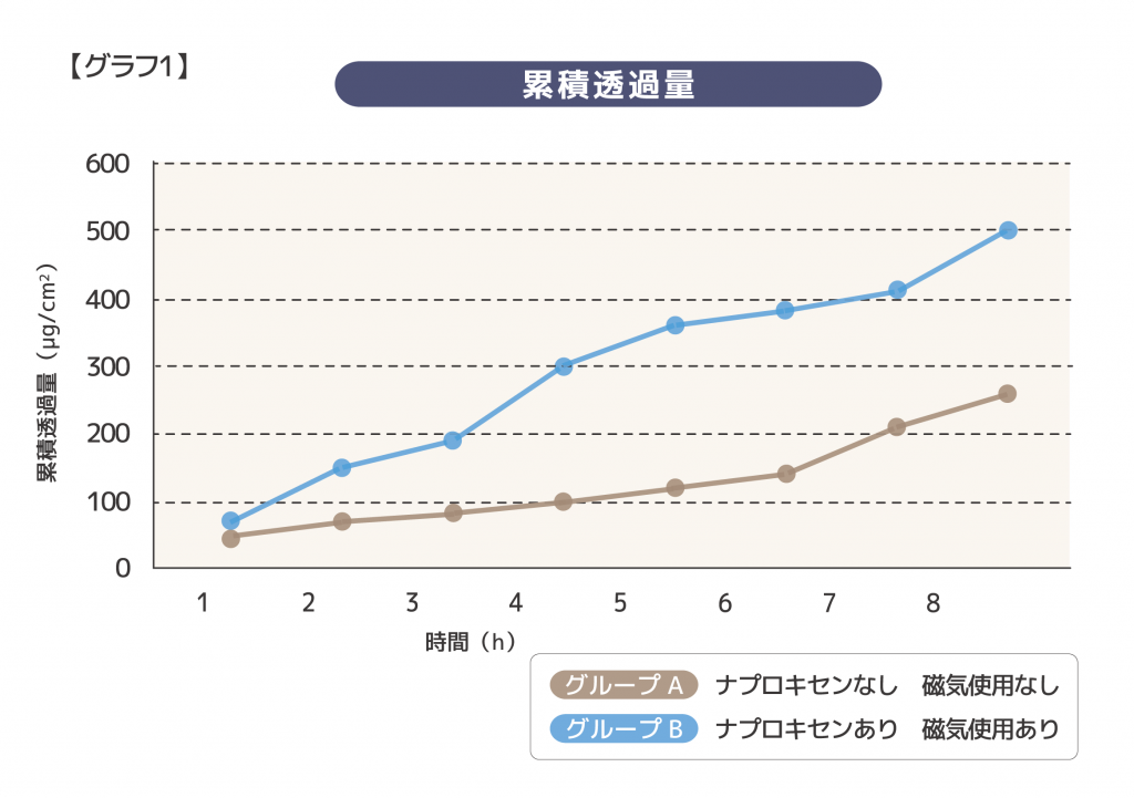 磁気を当てたグループBの方が、各時点でナプロキセンの透過量がより多いことがわかりました。