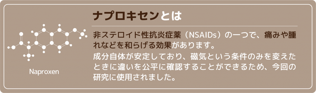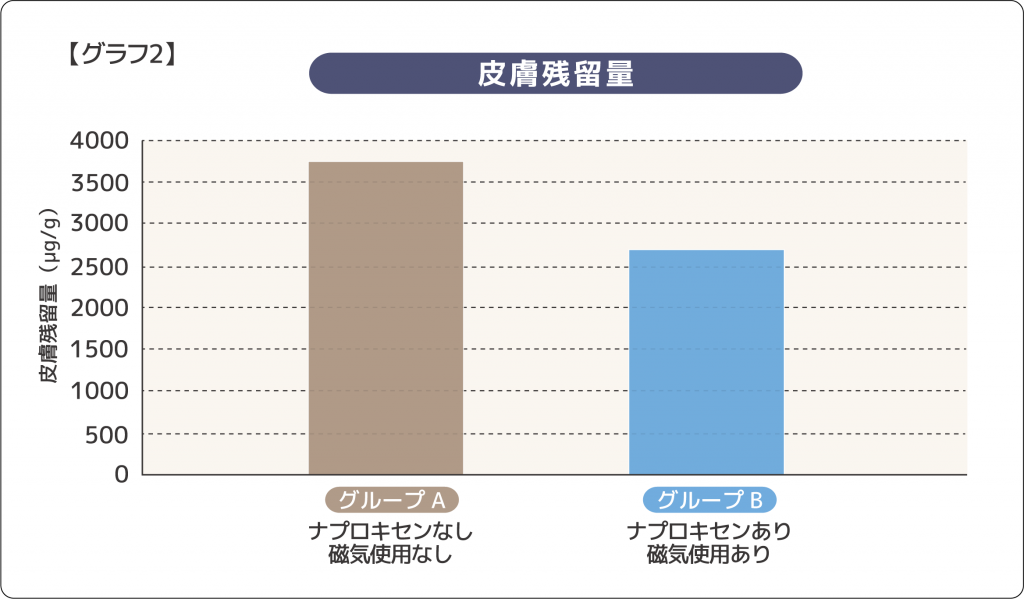磁気をあてたグループBの方が、皮膚に残ったナプロキセン量が少ないことがわかりました。