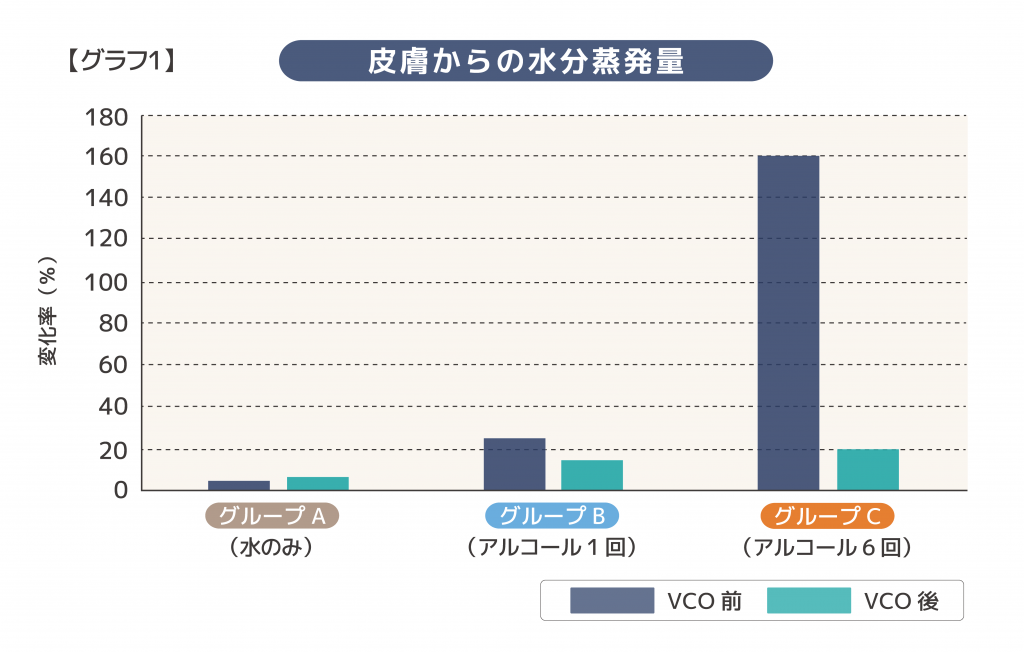 アルコールを6回使ったグループCは、水分蒸発量が最も多く、肌のバリア機能が大きく低下していましたが、VCOを塗ることで水分蒸発量が大きく抑えられました。(グラフ1参照)