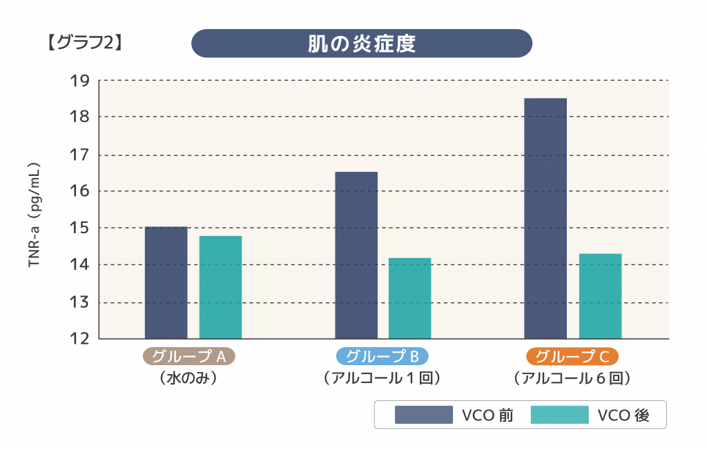この結果から、特にアルコールを繰り返し使用したグループCでは、VCO塗布前は炎症度が最も高くなっていますが、VCO塗布後は明らかに炎症度が低下しており、アルコールによる刺激を和らげる効果があることが示唆されました。(グラフ2参照)