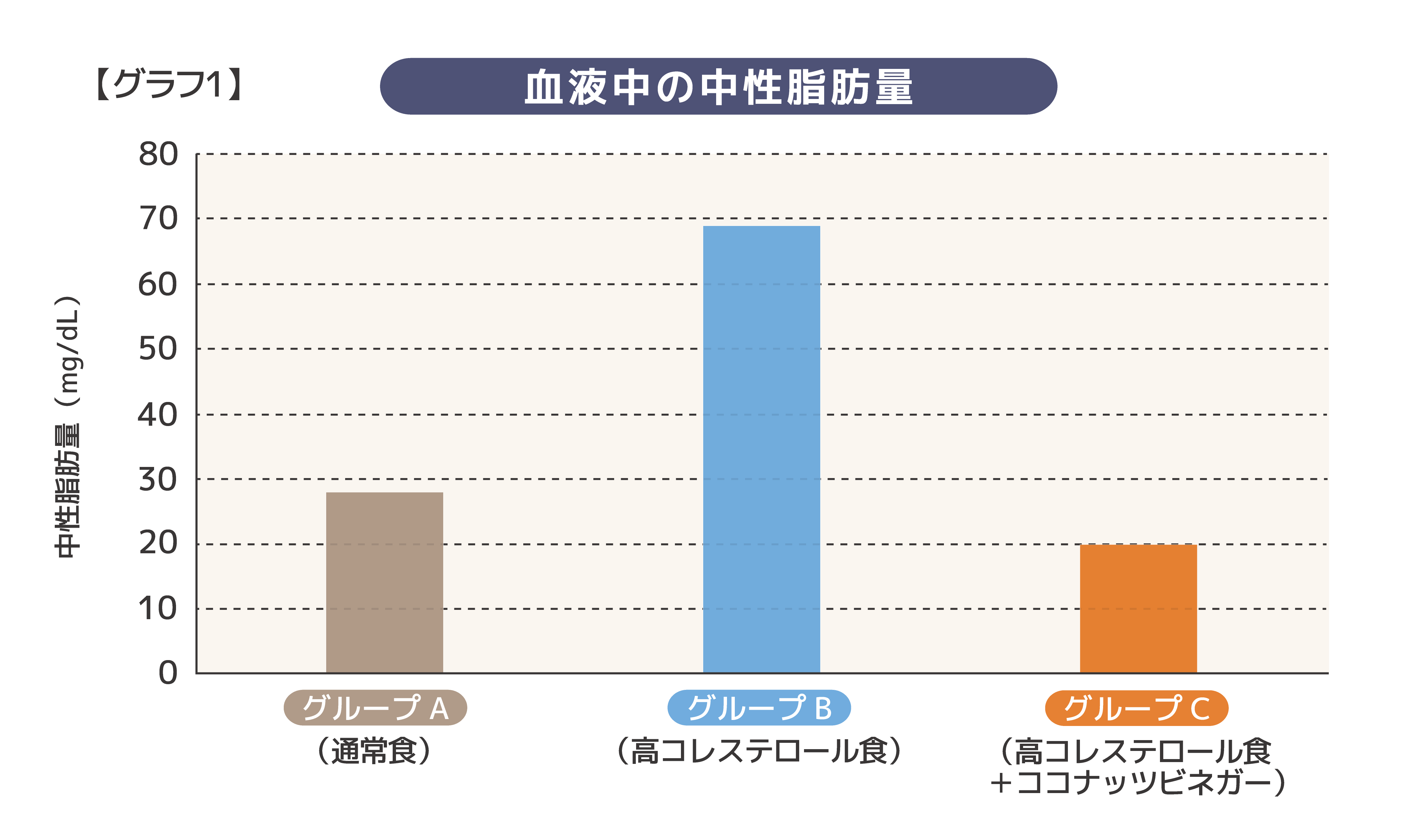 ココナッツビネガーを与えたグループCでは、血液中の中性脂肪の量が、高コレステロール食のみを与えたグループBよりも明らかに低下しました。