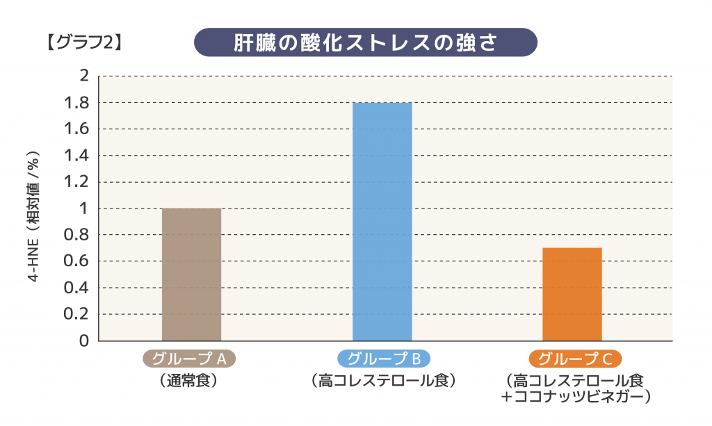 高コレステロール食を与えたグループBでは、肝臓内の酸化ストレスの指標である4-HNEが大きく増加していましたが、ココナッツビネガーを与えたグループCでは、その値が明らかに低下しました。