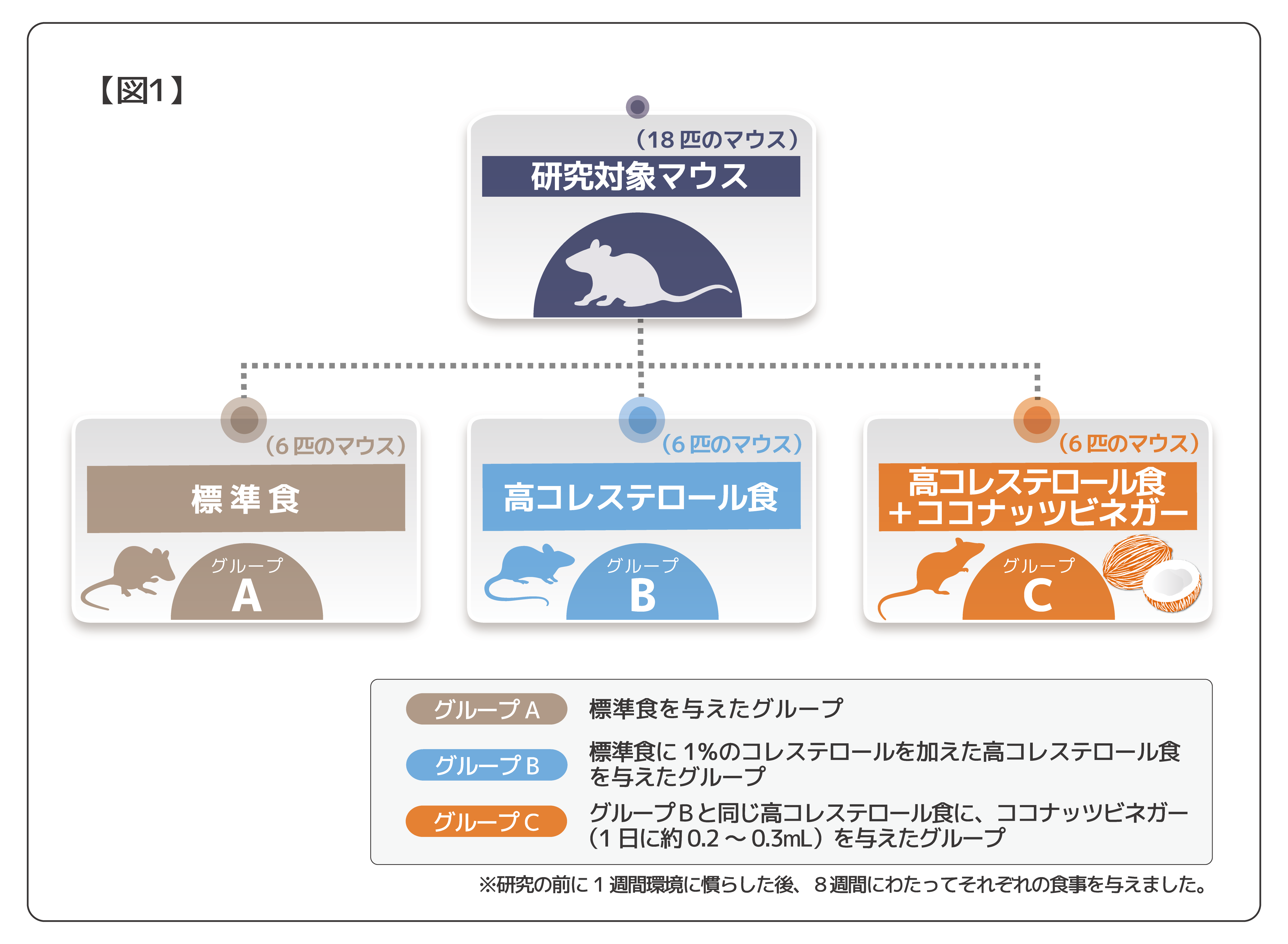 18匹のマウスを対象とし、標準食を与えたグループ、高コレステロール食事を与えたグループ、高コレステロール食とココナッツビネガーを与えたグループの、3つのグループに分けられました。(図1参照)