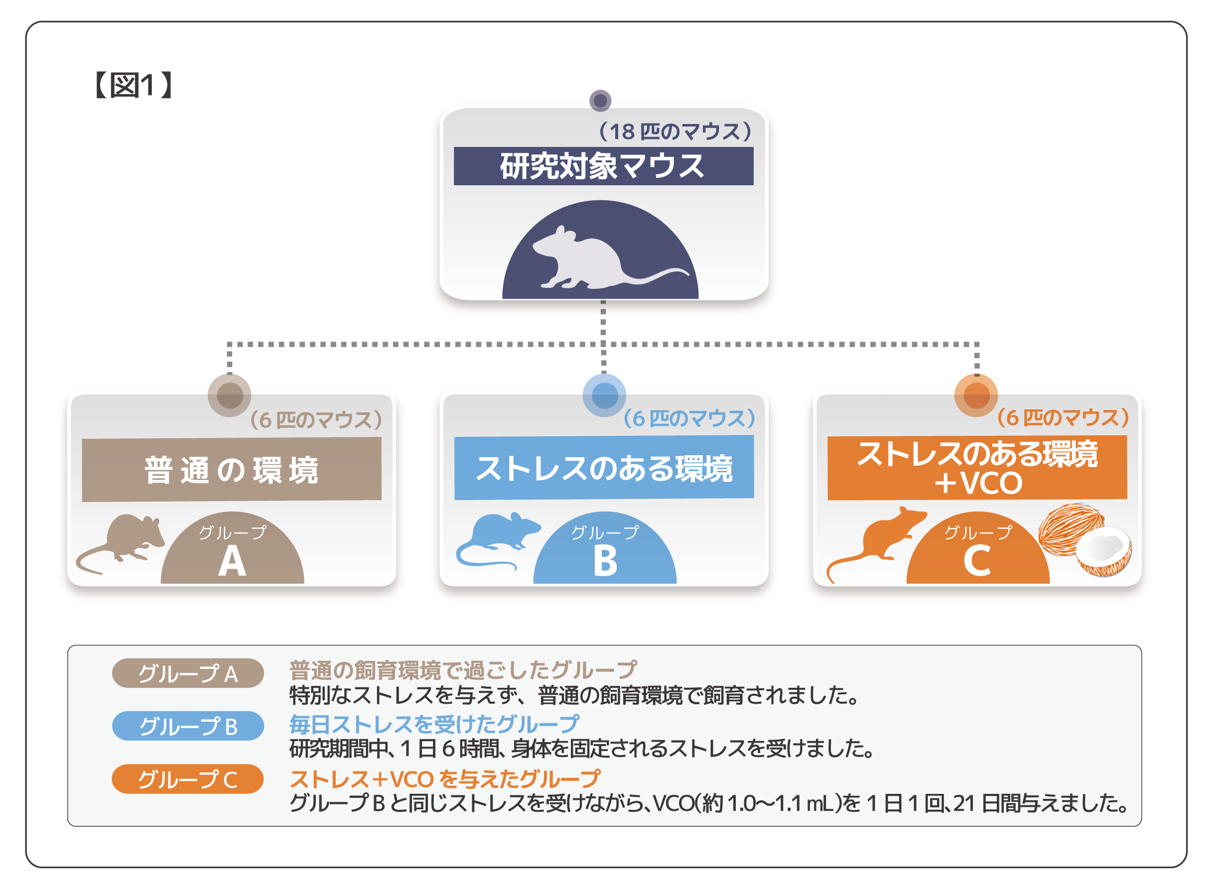 18匹のラットを対象とし、普通の飼育環境グループ、ストレスのある環境グループ、ストレスのある環境でVCOを摂取したグループの3つに分けられました。